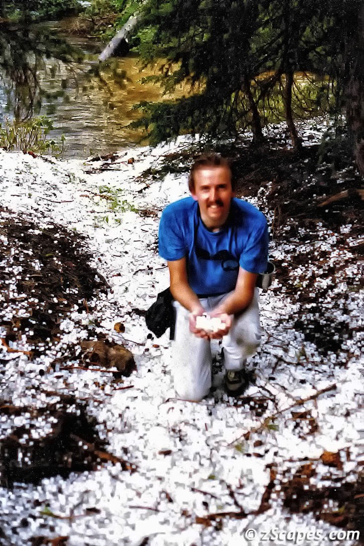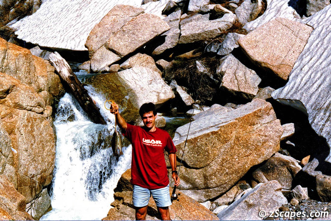 The most memorable part of the backcountry trips was while we were up in the Lewis Lakes area on a beautiful summer day, getting caught in a hail storm. I had hiked to the upper lake while George fished the middle. With a commanding view at Upper Lewis, it could spy a storm rolling in and quickly descended to let George know. George had found a great fishing spot on a rock ledge, the only problem being he could not climb back up the slick granite rock face! Into the lake he went, dried off and we started a sprint down the mountain to our campsite. As this was just our second year, we learned another valuable lesson. Do not day hike in just your t-shirt, be ready for that shift in weather. Anyways, as we sprinted from cover to cover as the hailstorm swirled all around us, one time pinned down as it felt the hail was coming at us from 360 degrees, we finally made it to camp and discovered the third valuable lesson. Plan your tent site to keep it dry and not in the path of a wash. Needless to say, next major purchase was a real tent, not the one from the 5 and Dime.