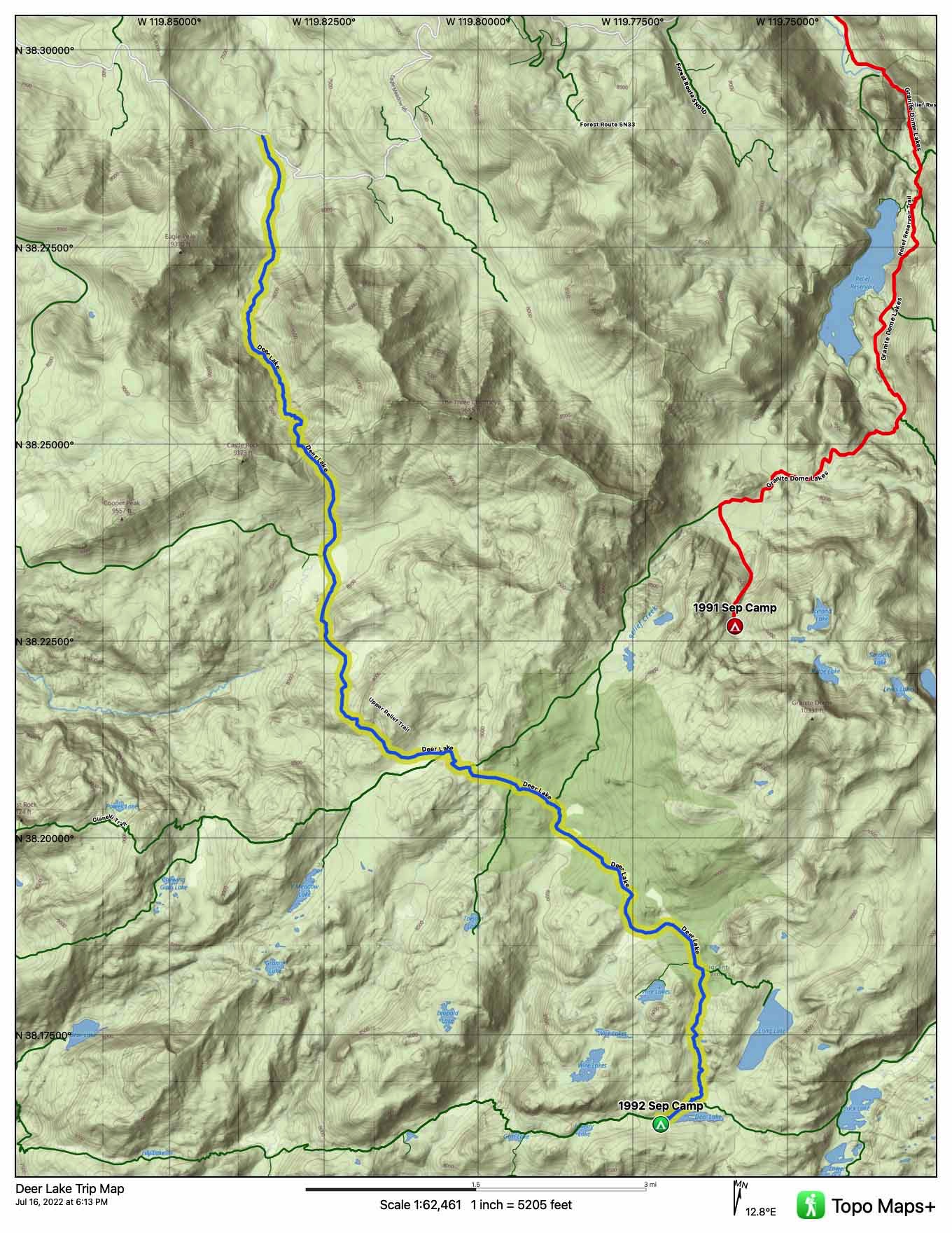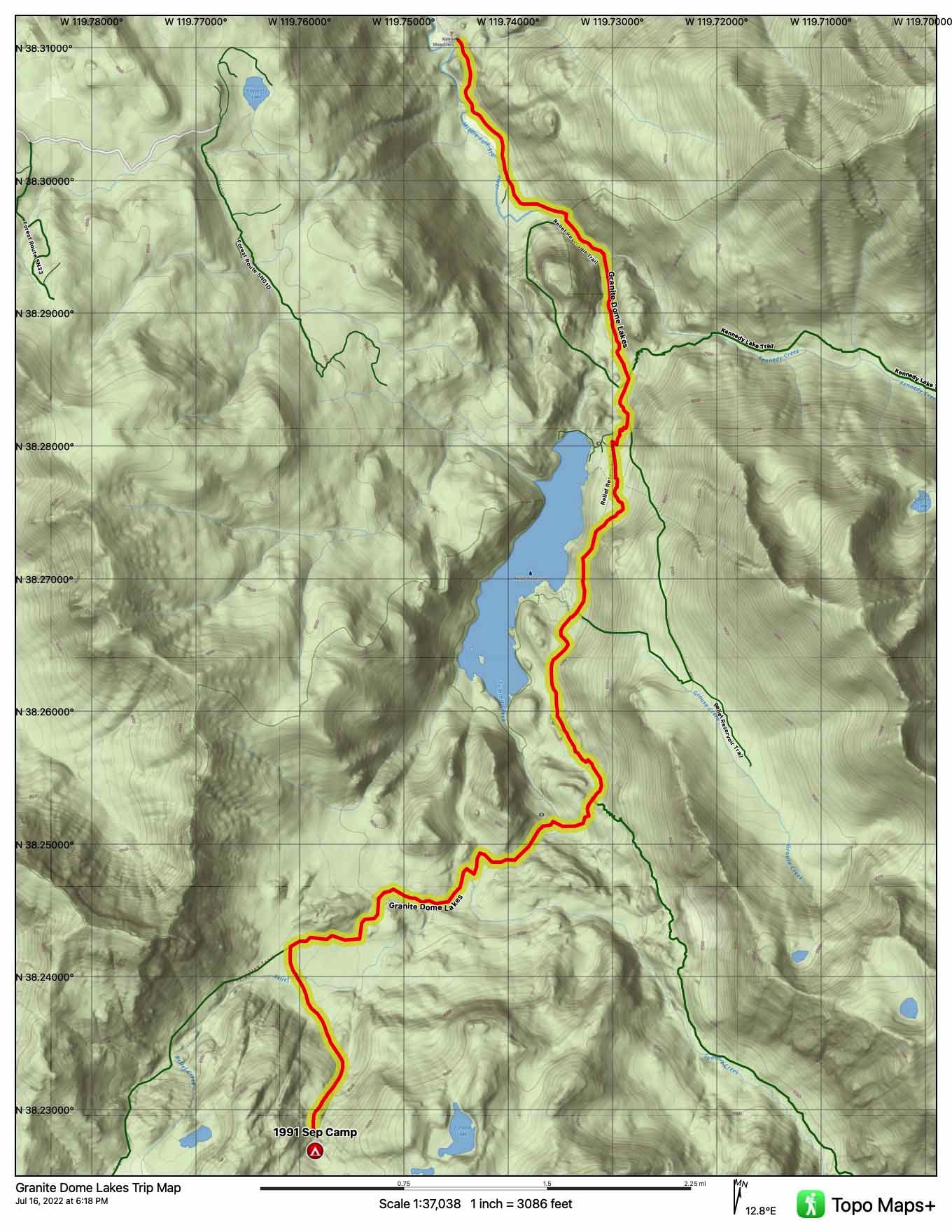 Two Emigrant trips this year, however, it was busy elsewhere. Our longest backcountry trek into the John Muir Wilderness and an Alaskan fishing trip made for a busy summer. The Kennedy Lake opener was a 'quick turn' in May and we did a shortcut trip to Deer Lake, bypassing the Kennedy Meadows trailhead via Eagle Creek. The starting view was a spectacular sunrise over Granite Dome and a considerable drop down to Lower Relief Valley.