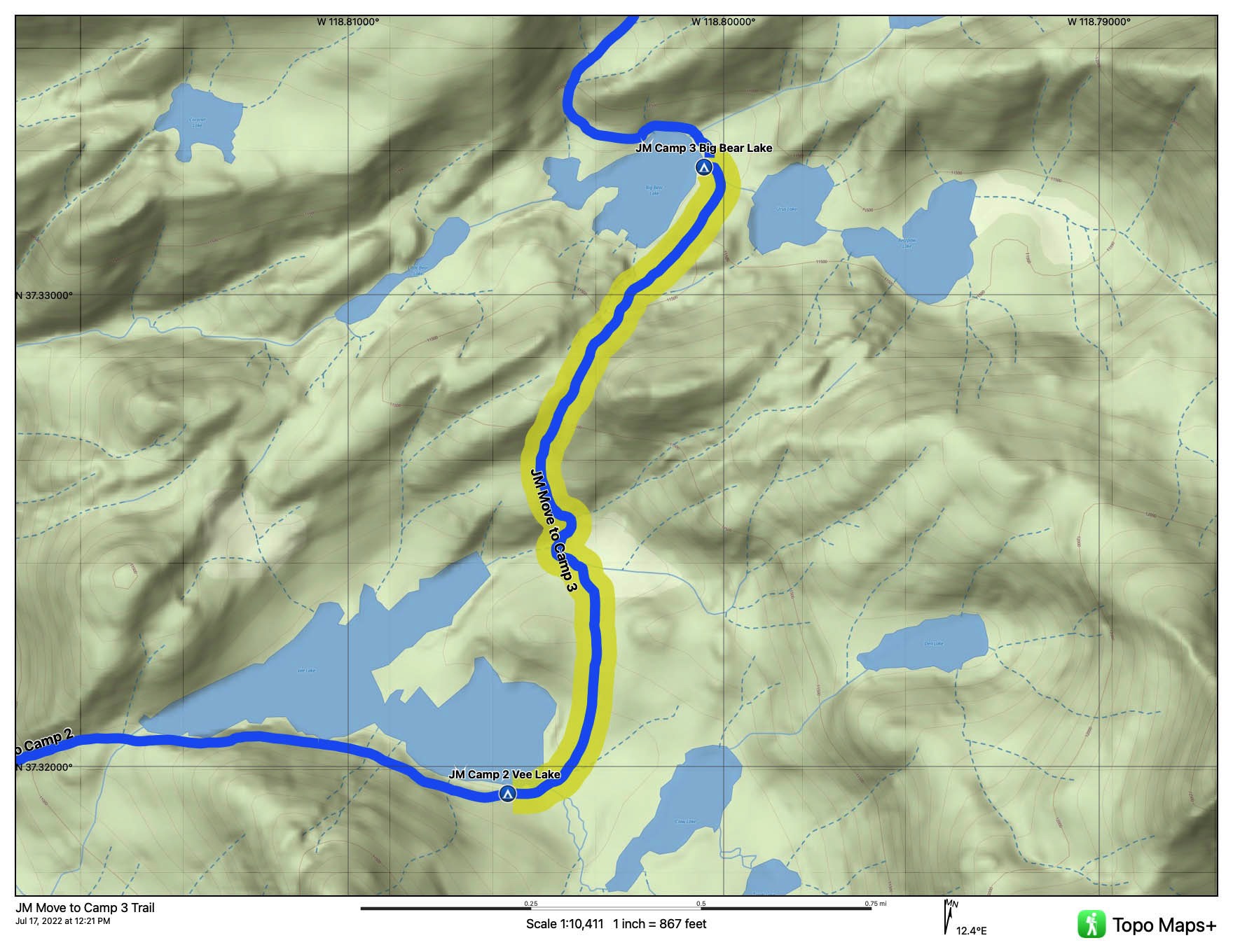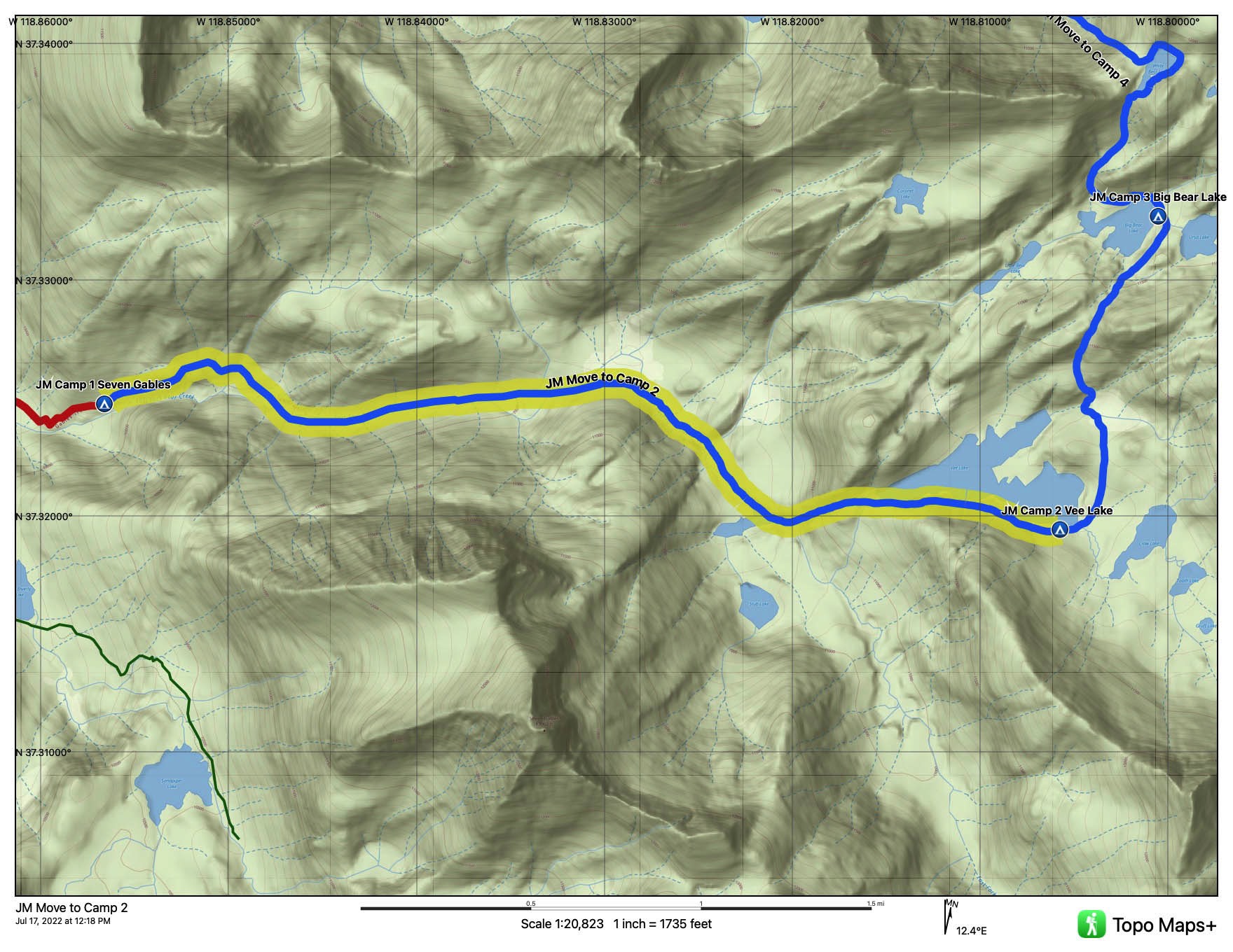 | Day 2 | Move to Vee Lake | 3.1 miles | Total elevation 1,655 ft |