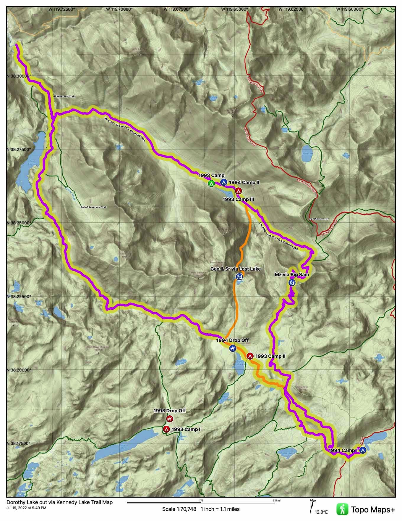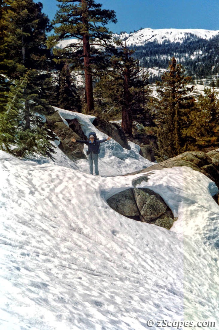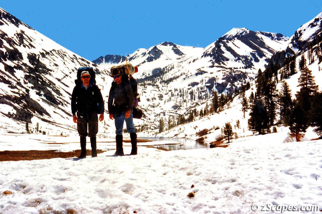 One trip only this year, covering Emigrant and Yosemite Wilderness as my attentions were focused on getting married in October to the love of my life, Betsey. Kennedy Meadows packed us in to Emigrant Meadow Lake and we hiked via Bond Pass down to Dorothy Lake. This was to be our first steps into Yosemite Wilderness and whole new world to explore. We hiked over into the Sisters Lakes and explored all around Dorothy Lake. George sharpened his climbing skills and I was fortunate enough to snap a picture of a Whitetail Ptarmigan. Found out many years later this was an experimental planting released in 1971 and had made it all the way to 1994 when we wandered by. Curious if they still are habituating the area, so will have to go back and find out for myself. On our return, we opted for the shortest path that took George and George Sr. via Lost Lake and I tackled the trail up and over Big Sam to meet at Kennedy Lake. Added about 2 miles to my hiking, but was well worth the trek.