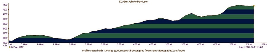 The day starts with a hearty breakfast, you pick up your lunch and then the mules magically appear and it is time to move on. Today's destination is May Lake, which is the main water source for Yosemite Valley and is nestled below Mt. Hoffman, which is also the geographical mid-point of the park. Uphill is the word of the day and the mules are at their best with one stretch of switchbacks that reveals a panoramic view of the Pacific Crest, both north and south. The view at lunch was worth the price of the trip alone. We continued on to May Lake and arrived in time to take a hike up Mt. Hoffman.