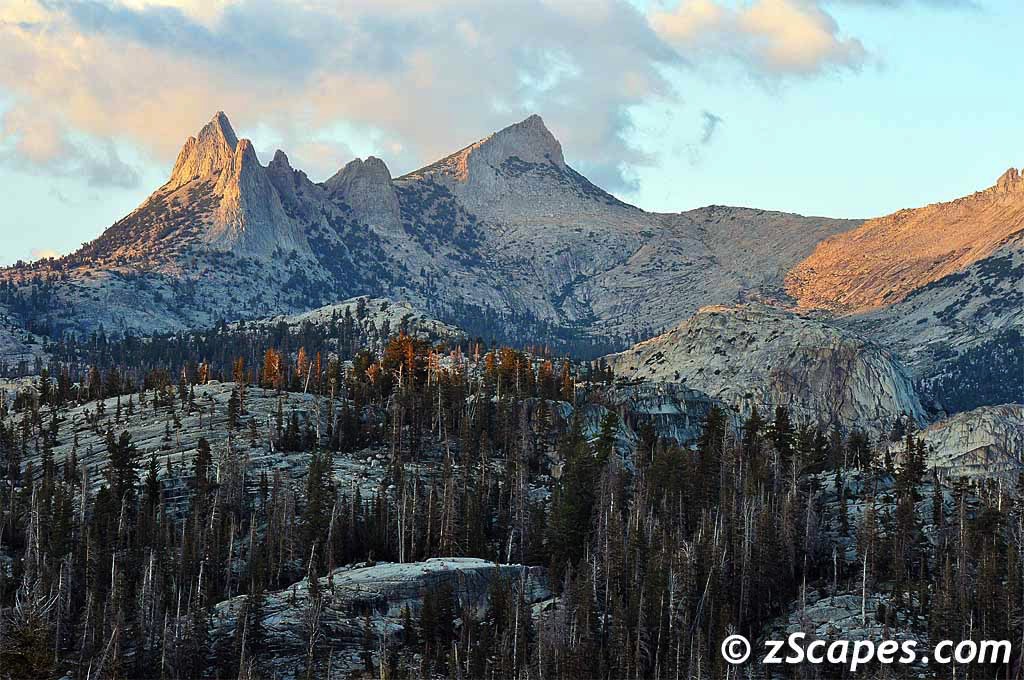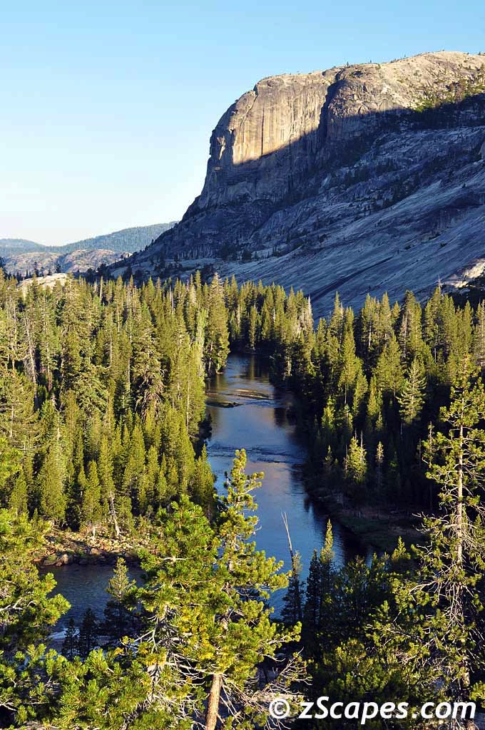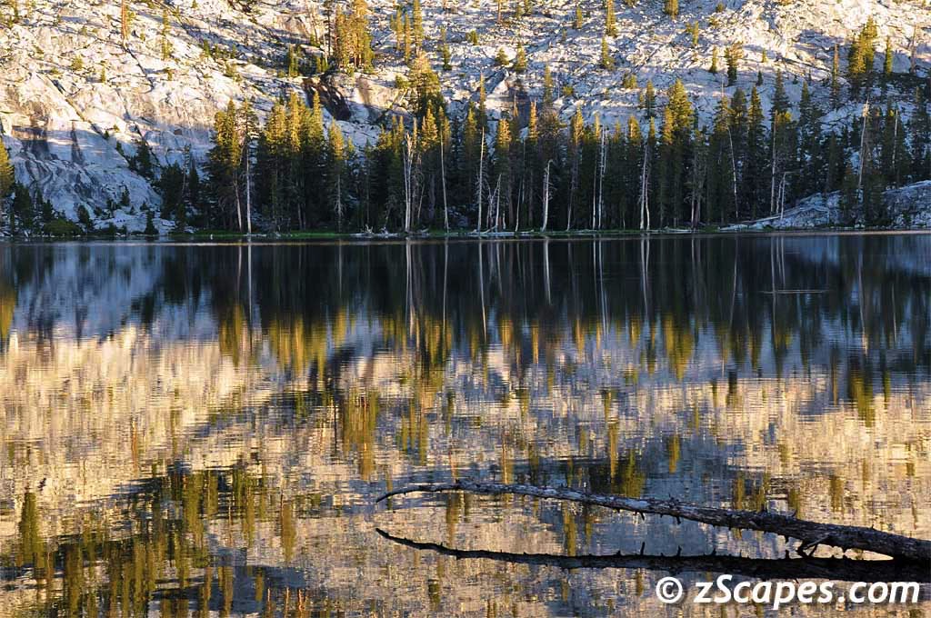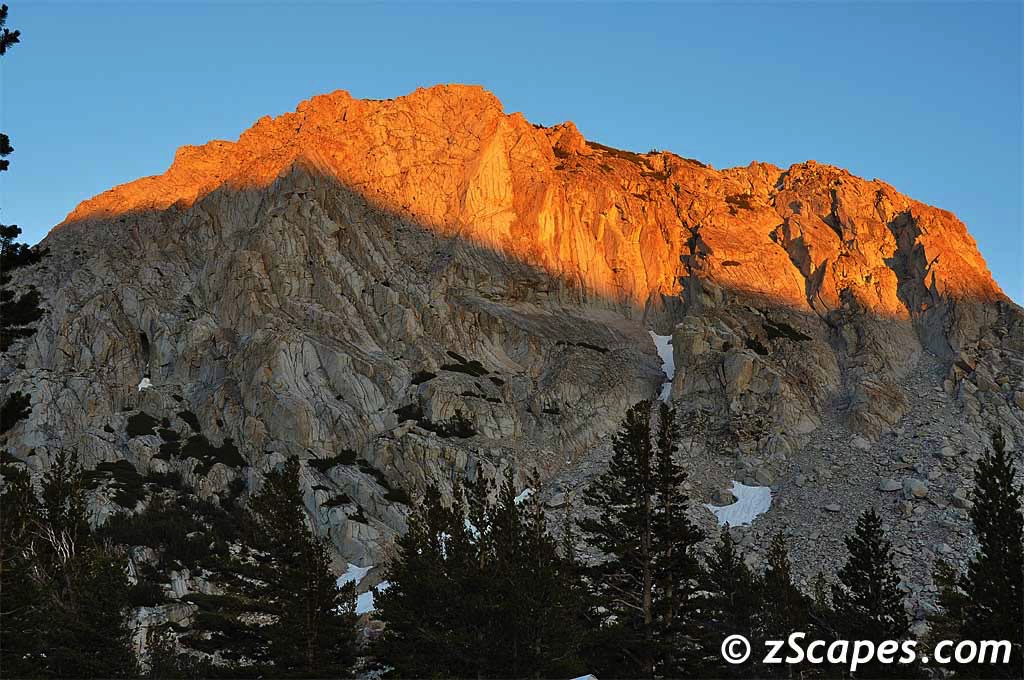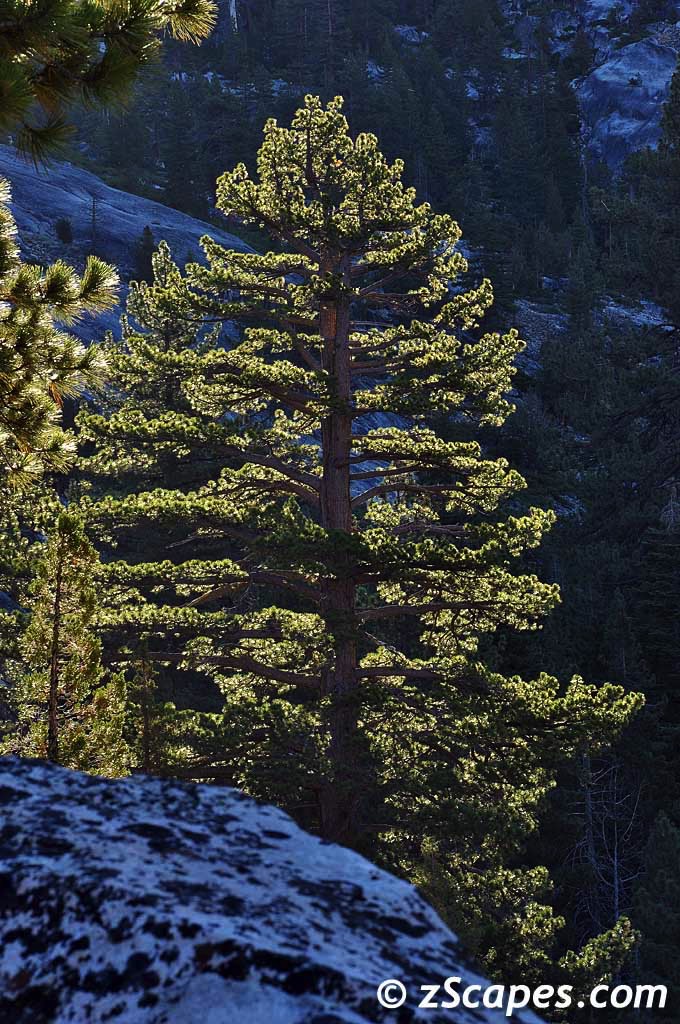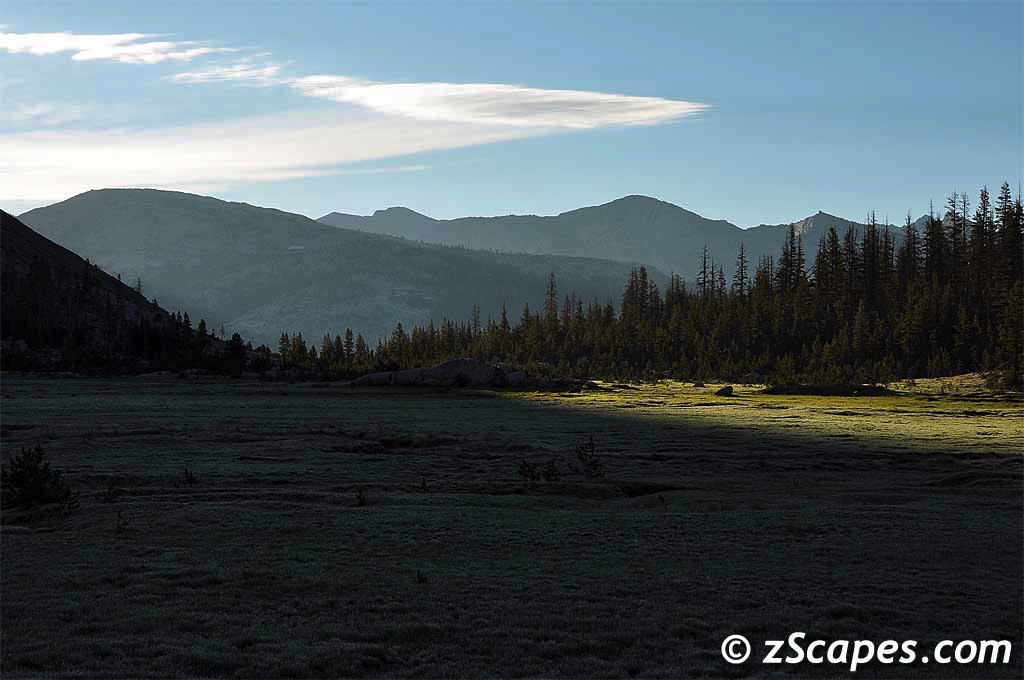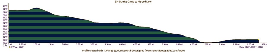 Merced Lake and the inflow of Lewis Creek are great spots for swimming, sun worshiping and a bit of fishing. Of interest is the largest White Pine on record on the trail as you enter the camp, right next to the backpacker campgrounds. Standing 217 ft tall with a 39 ft crown spread and a 7 ft 4 in diameter trunk, this tree has a total volume of 3510 cubic feet! When John Muir first passed through here in 1872 he called it Shadow Lake in a letter to Mrs Carr, a botanist and mentor from his days at the University of Wisconsin. However, it was named officially as Merced Lake on the first edition of the Mt Lyell 30' map. Some earlier maps did not even show a lake, which is remarkable in that it is one of the largest in Yosemite. The nights are relatively warm at this lower elevation, after the last two camps, and George tried his luck fishing. Our 'gang' went on an after dinner stroll to help digest another filling meal and walk off some of the adult beverages that we consumed and caught up with George and his fish tales! What I really enjoyed here was the range of trees, vegetation and a pocket of Jeffrey Pines, my favorite tree, just above the camp. It reminded me of the Jeffrey Cathedral along the Huckleberry Trail above Relief Reservoir after crossing Grouse Creek. The sweet scent of vanilla infused the early morning air as I tried to capture the essence of sunrise before mounting up.