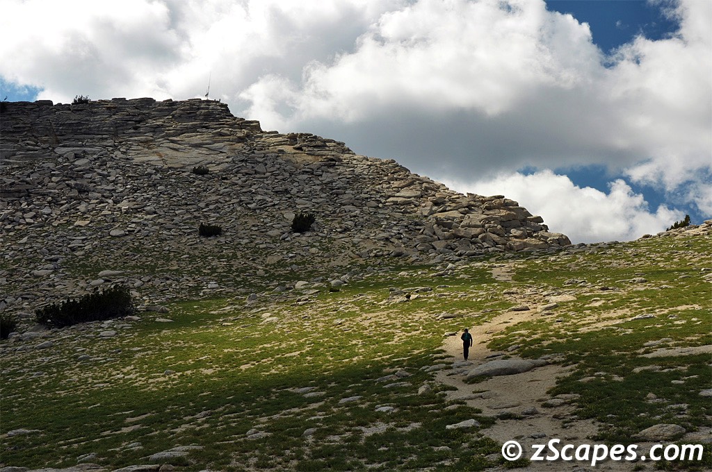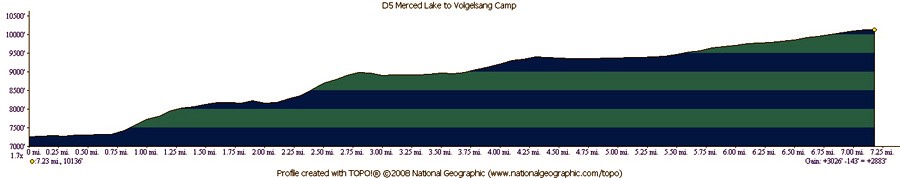 The move from Merced to Vogelsang is a 2833 foot climb and it is pretty much uphill all the way. Right after departing Merced Lake we took the FletcherDolphin Dome Canyon trail and started a steep ascent with our trusty mules and Tonka was up to the task. It was a beautiful day and on our first stop we had an incredible vista of Merced Lake and down into Little Yosemite Valley, with a straight shot at Half Dome. I was particularly impressed with the granite formations as we wound up the canyon following Fletcher Creek and George named a unique feature on the face of a dome as Dolphin Dome! I checked with a well respected Australian geologist (my cousin) and he confirmed that it was most likely caused by exfoliation where the layers of rock peel off as they weather away. After lunch the trail catches up to a classic glacial valley with green meadows, dramatic peaks on both sides and a good look at the Volgelsang Peak uplift. The mules huff and puff up the last climb, knowing that tomorrow is all downhill.