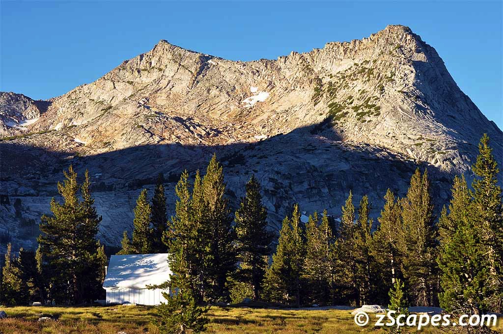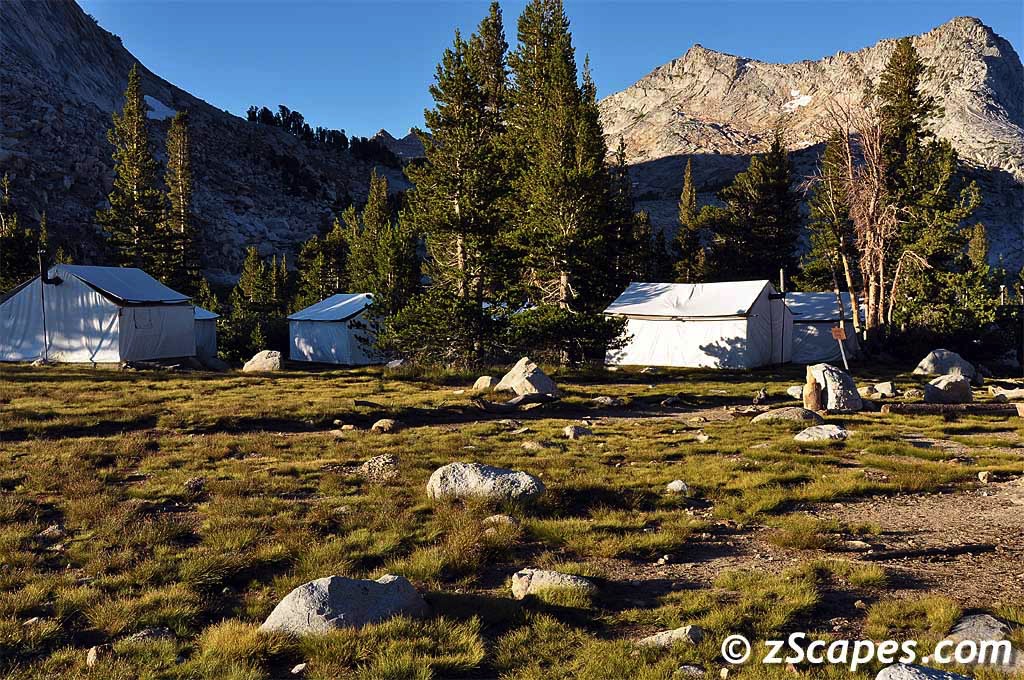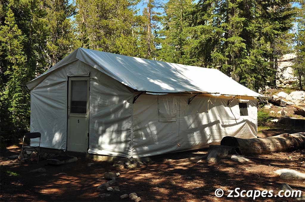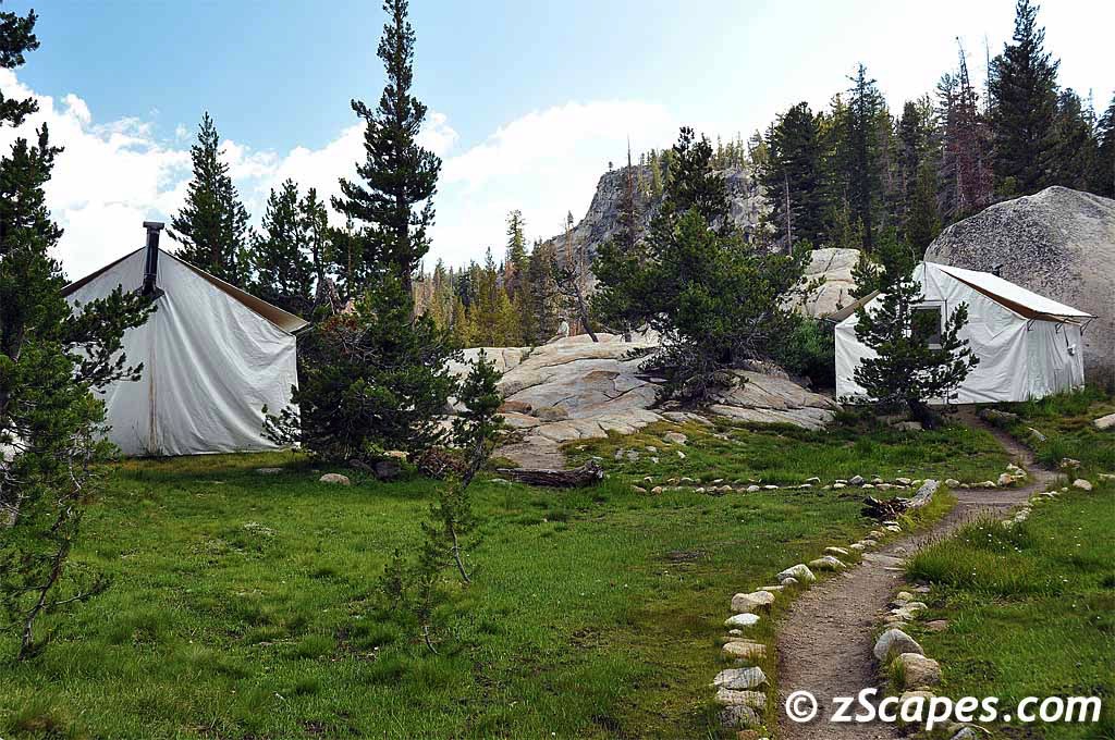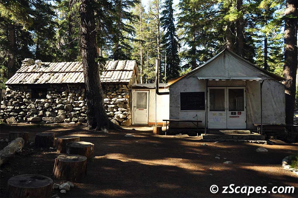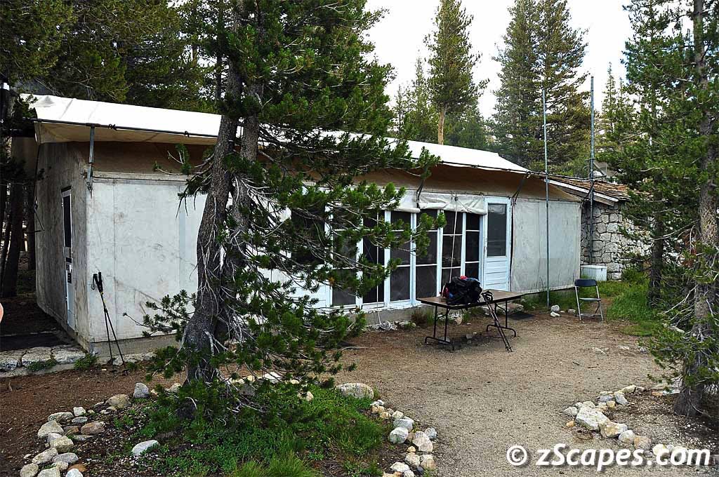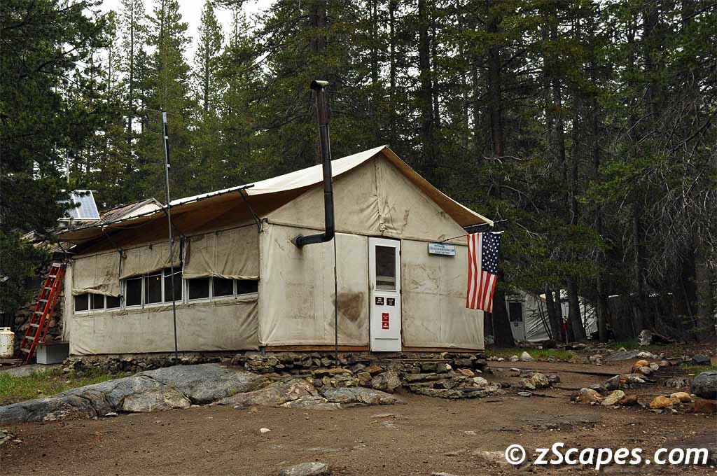 Named by James McCormick on the request of R.B. Marshall, he immediately suggested 'Glen Aulin' which means beautiful valley or glen and wrote it in a way so that it would be correctly pronounced. The camp was created in 1927 and has moved from the original location as the setting was mosquito infested. Good idea! Eight tents provide sleeping accommodations for 32 and the kitchen produces great meals. For both of my visits we were treated to a turkey dinner with all the trimmings. The camp is in a strategic location if you wish to make it a base and run day hikes nearby, such as Waterwheel Falls. Sunsets can be spectacular with just a quick walk from camp over the bridge and up a quick scramble off the trail that heads down Tuolumne Canyon.