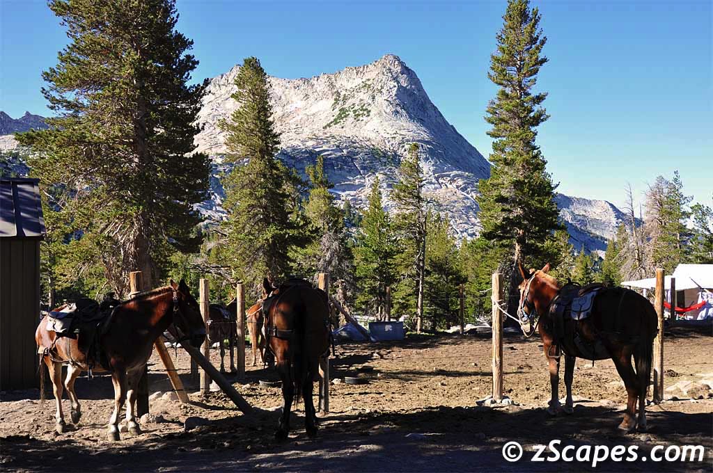 When moving from May Lake to Sunrise Camp, there is not much of an elevation change. However, it entails a descent of 1734 ft to Tenaya Lake, crossing H120 and an ascent of 1768 ft. When we got to the highway, I was amazed at drivers more interested in speeding then taking their time and enjoying the views and can see why bear fatalities are on the rise. This was the toughest day for the mules and I was glad they were taking me, as I would not have enjoyed that hike with a heavy pack. We stopped for lunch with a great western view of Clouds Rest, Half Dome and Mt Watkins. The final push to Sunrise takes you past the Sunrise Lakes which looks to be a good spot to spend the night if you are backpacking.