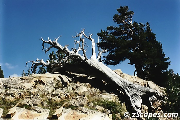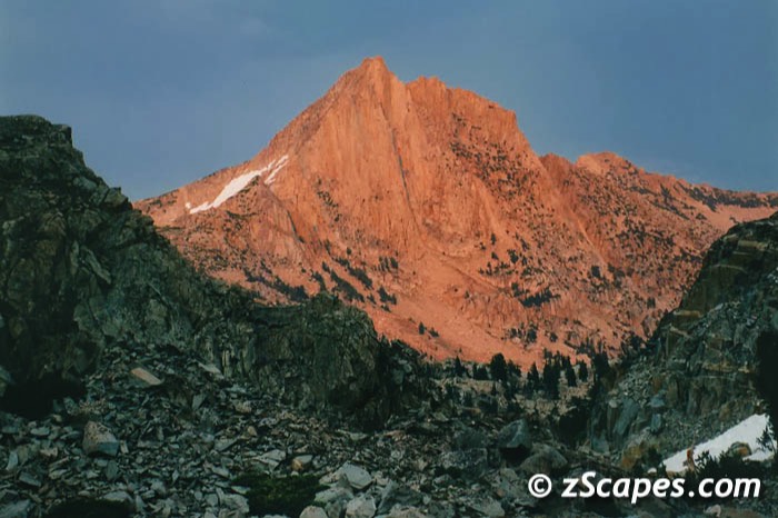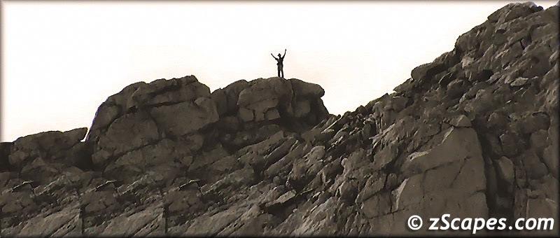 Now to say that George had an obsession with climbing Tower is an understatement. He has lived, slept and breathed Tower Peak for an entire year and was ready to surmount his challenge. I was the somewhat hesitant partner who was going along to pull him out of harms way or knock some sense into him if need be. We used our first day to acclimate and popped over to Mary's Lake. The weather was going in and out on us, and we had to make a few stops to get out of the rain, but it was a good hike and prepared us for the ascent on Wednesday. Next day the sun rose bright and early and Tower invited us to scale it's challenging Peak. We were off in a dash and scrambled up to the saddle between Tower and Watchtower with relative ease. Now the run along the Northwest ridge was relatively sedate until we crossed 11.3K and it became a narrow ledge running to the North face of Tower Peak. That was enough for me and I was content to stay, watch and shoot photos from my vantage point. George then made his way up cautiously through the Northwest chute and soon was standing high above me on Tower Peak. Now the big question was how long he was going to stay up there to celebrate. Which was answered rather rapidly as a T-Storm rushed in from the south and made the decision for us. Another quick scramble down the mountain, ducking under windswept Lodgepole's capped off another perfect day in mountains.