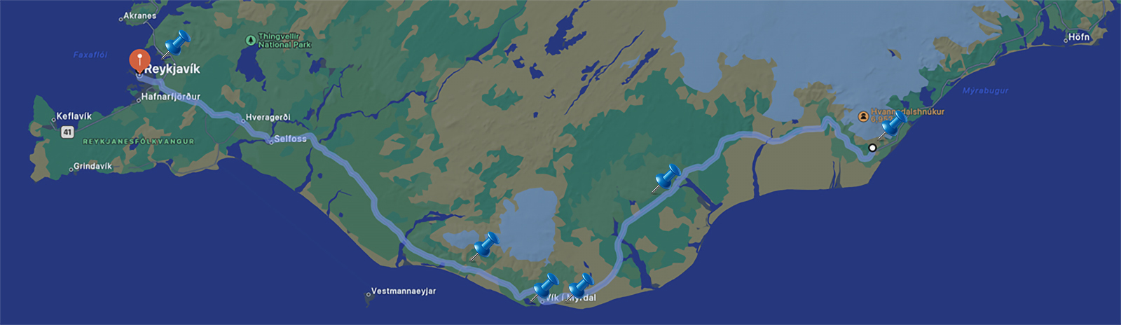 Our guide, Rob, was ready to go after we had a pleasant stay @ Hótel Reykjavík Saga and top notch meal at The Fish Market. Highly recommend if you enjoy sushi & Japanese cuisine. The day started with a quick trip downtown to re-equip Betsey's cousin Kathleen, who joined us, as she had the misfortune to arrive without her bags after a missed connection in Newark! We did some sightseeing in Reykjavik and then headed along the South Coast with stops at Skógafoss waterfalls, Reynisfjara Black Sand Beach (basalt formations) and Fjaðrárgljúfur canyon. A 217 mile trip to Fosshótel Glacier Lagoon hotel thru spectacular country.