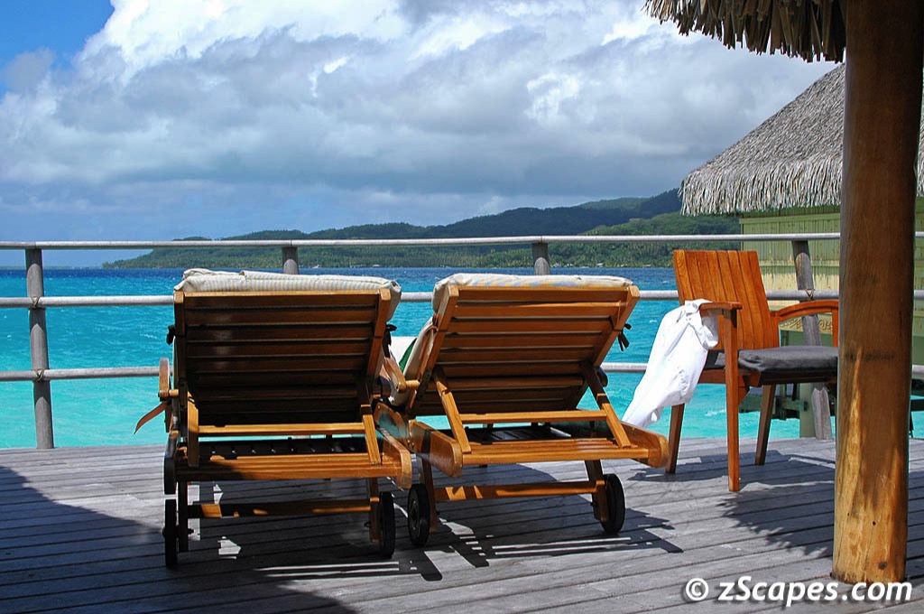 After a wet introduction and short tour of the facilities, we were escorted to our over-the-water bungalow. We have stayed at some fine hotels/resorts over the years but this was as over the top as we have been. Each bungalow had approx. 100 square meters of living space, divided up between a large bedroom with a king plus size bed, a bathroom behind sliding panels and two decks. The main deck had two teak lounge chairs with a lanai that covered a table, bench and chairs so you could enjoy the outdoors even in a tropical rain shower, and a lower deck with steps to the lagoon and an outdoor shower.