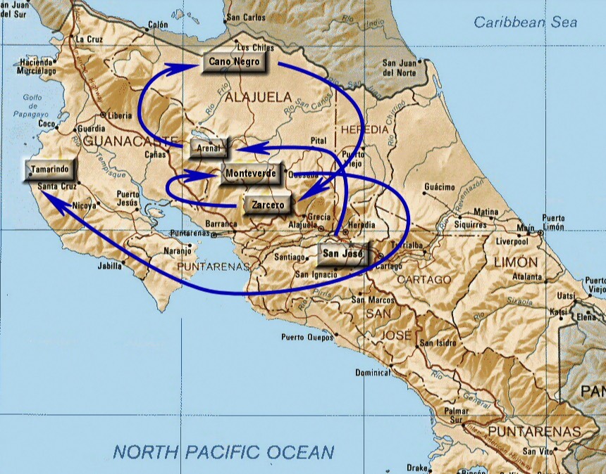 Arenal Area MapOur guides started us off early that following morning on our way to Arenal Volcanic National Park. The weather did not cooperate as the clouds never lifted far enough to reveal a peek at this majestic volcano. However, Alex was just a fountain of knowledge on anything Costa Rican and we quickly bonded with our 2 local guides. Alex had this wonderful penchant for spotting wildlife along our travels. His eyes were darting all the time and he would capture the slightest movement that foretold a special creature was nearby. All of a sudden he would be gently telling Carlito to stop or turn around and we knew a small treat was awaiting us, once we threaded back through the potholes. We saw Sloths, Toucans, Iguanas, butterflies and on and on and on. The El Tucano Spa and Inn was an enjoyable hotel which tapped the warm water flow from the Volcano and transformed it into a world class spa. Our next journey would take us far north to a protected Bio-preserve and spectacular sights. Roam through the Photo Gallery below to get a glimpse and then continue on to Cano Negro.