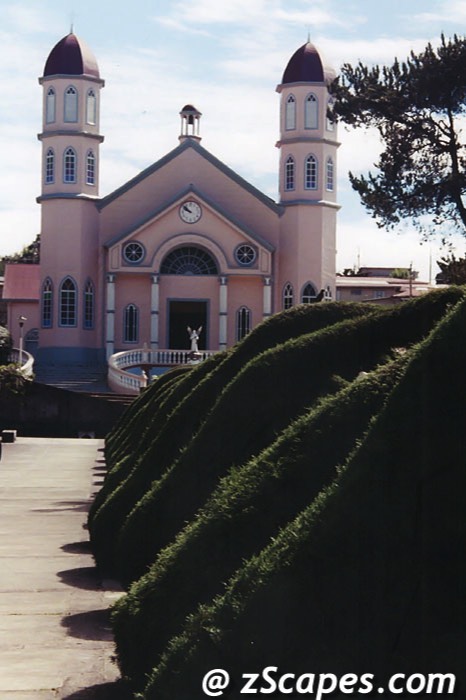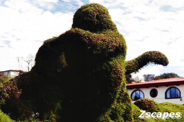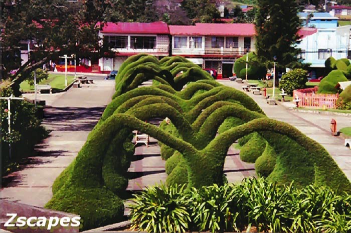 Zarcero Map Nestled in the Cordillera de Tilaran is a small community that has a topiary park in front of the town church. The bushes are presented in a variety of shapes and it is an enjoyable and relaxing stop off between East and West Costa Rica. The caretaker is world-known, as Disneyworld attempted to lure him away form his homeland to care for their gardens. In the end he decided to stay with his community. A small victory for preservation of local cultures. Follow the Photo Gallery for some unusual creatures of vine and leave. Our next adventure is the Monteverde Cloud Forest.