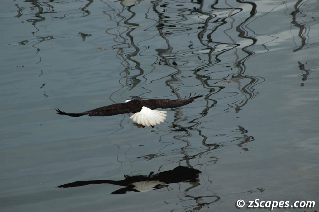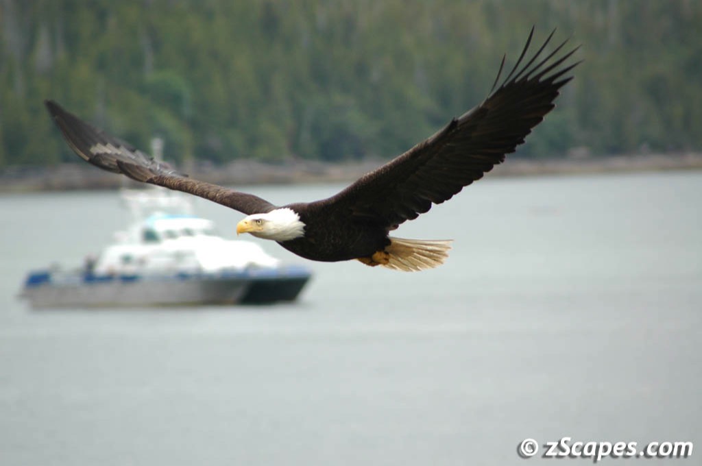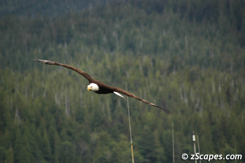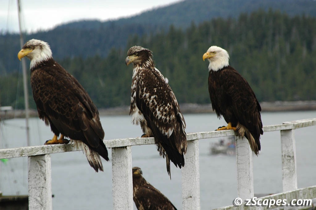 What do you think of when someone says, " Look-bald eagles!" . For most of us it is the sight of a large powerful bird overhead with a crown of white soaring in the thermals. A real treat is to see two or three together. Ironically in Prince Rupert the symbol of America is perched in just about any direction you look. They are in the trees at a main intersection, they are on the pier, they are flying past your restaurant's window at dinner time. When we returned, there was enough time to stroll around and photograph these magnificent raptors.