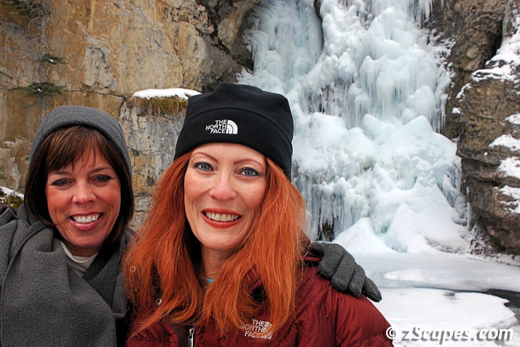 Up at a decent time on Saturday and with a quick breakfast at the snack bar, we met George and Sarah and it was off to take in the winter wonderland. Our plan was to take the scenic drive along the Bow Valley Parkway to Lake Louise and stop along the way for pictures and a hike, if the weather cooperated. Johnston Canyon was our first stop and we had a great hike through this frozen canyon to both Lower and Upper falls. A limestone formation has been shaped into a steep canyon from over 350 million years of water flow and produced walls as high as 100 feet and in some places less than 20 feet across. There is an elaborate trail system with suspended walkways bolted to the rock to lift you over sensitive and wet sections.