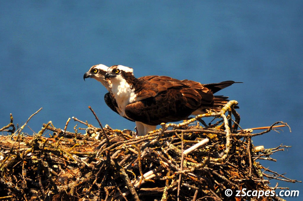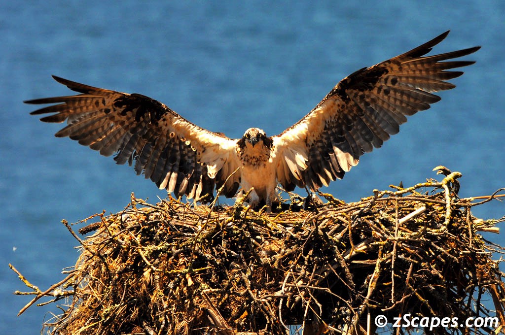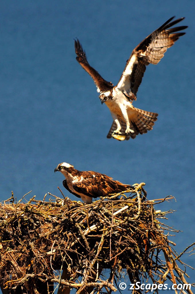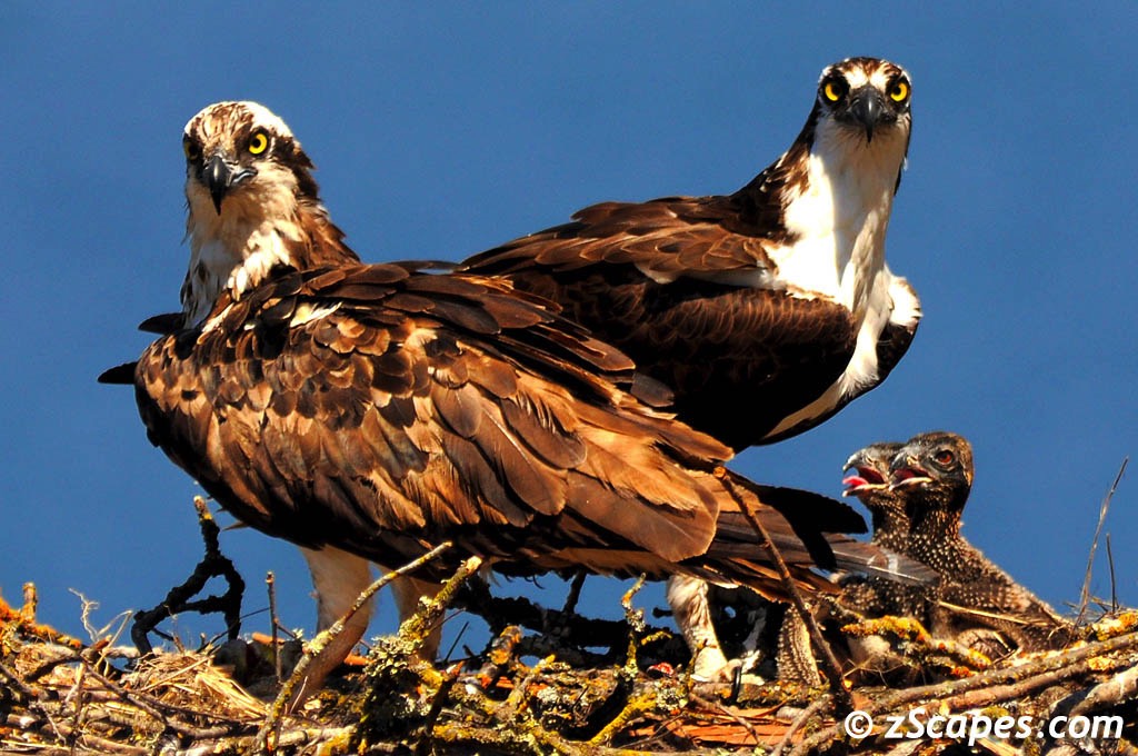 While we found the parents, there was no obvious chick activity so we decided to give it another try in June and hope for a late or second hatch. This time we hiked in and set up in a perfect blind under the shade of a Black Oak. To our amazement, two chicks were poking their heads up and we knew there was potential for a good photo day. The big male was on patrol and feeding the family, while the female was guarding the nest and repelling any fool hardy bird that even flew close. When we zoomed in on the pair, you could really see that the female was ragged, presumably from the harsh spring weather and the toils of feeding and defending her precious offspring. However, when you looked in her eyes you could instantly sense the determination and admire her bravery. I never get tired of watching Ospreys and have been hooked ever since I saw them along the Columbia river with Gerry Lamarre in June of 2002.