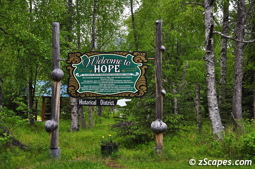 Population 137, Hope lies directly across Seward Highway as you head to the end of the Turnagain Arm in the Cook Inlet. It is a long drive by car, but a straight shot if you fly or swim (not recommended). Just 17 miles off the highway it is a nice drive to this quaint old mining town established in 1896 and a post office in 1897. Its main attraction now is as an Anchorage weekend getaway with second homes/cabins and promotes itself as a " Historical mountain hideaway by the sea." Hiking, biking, river rafting, fishing are among the available activities along with an outdoor museum and local arts scene. Looks like a fun place to go and relax and get some quiet!