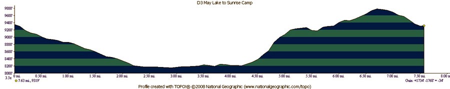 When moving from May Lake to Sunrise Camp, there is not much of an elevation change. However, it entails a descent of 1734 ft to Tenaya Lake, crossing H120 and an ascent of 1768 ft. When we got to the highway, I was amazed at drivers more interested in speeding then taking their time and enjoying the views and can see why bear fatalities are on the rise. This was the toughest day for the mules and I was glad they were taking me, as I would not have enjoyed that hike with a heavy pack. We stopped for lunch with a great western view of Clouds Rest, Half Dome and Mt Watkins. The final push to Sunrise takes you past the Sunrise Lakes which looks to be a good spot to spend the night if you are backpacking.