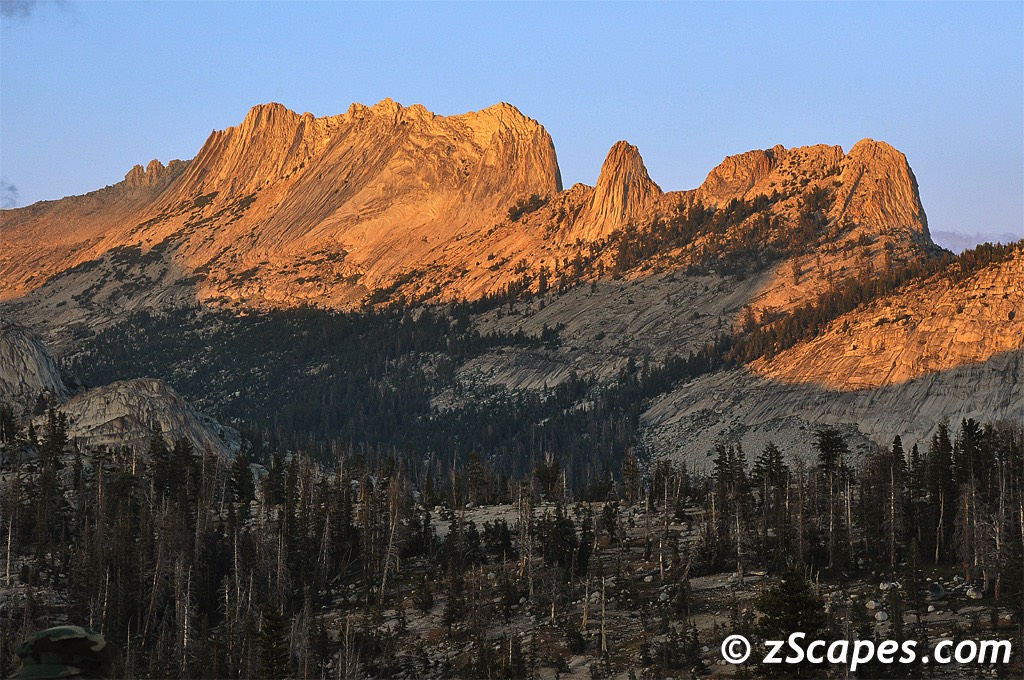 Merced Lake and the inflow of Lewis Creek are great spots for swimming, sun worshiping and a bit of fishing. Of interest is the largest White Pine on record on the trail as you enter the camp, right next to the backpacker campgrounds. Standing 217 ft tall with a 39 ft crown spread and a 7 ft 4 in diameter trunk, this tree has a total volume of 3510 cubic feet! When John Muir first passed through here in 1872 he called it Shadow Lake in a letter to Mrs Carr, a botanist and mentor from his days at the University of Wisconsin. However, it was named officially as Merced Lake on the first edition of the Mt Lyell 30' map. Some earlier maps did not even show a lake, which is remarkable in that it is one of the largest in Yosemite. The nights are relatively warm at this lower elevation, after the last two camps, and George tried his luck fishing. Our 'gang' went on an after dinner stroll to help digest another filling meal and walk off some of the adult beverages that we consumed and caught up with George and his fish tales! What I really enjoyed here was the range of trees, vegetation and a pocket of Jeffrey Pines, my favorite tree, just above the camp. It reminded me of the Jeffrey Cathedral along the Huckleberry Trail above Relief Reservoir after crossing Grouse Creek. The sweet scent of vanilla infused the early morning air as I tried to capture the essence of sunrise before mounting up.