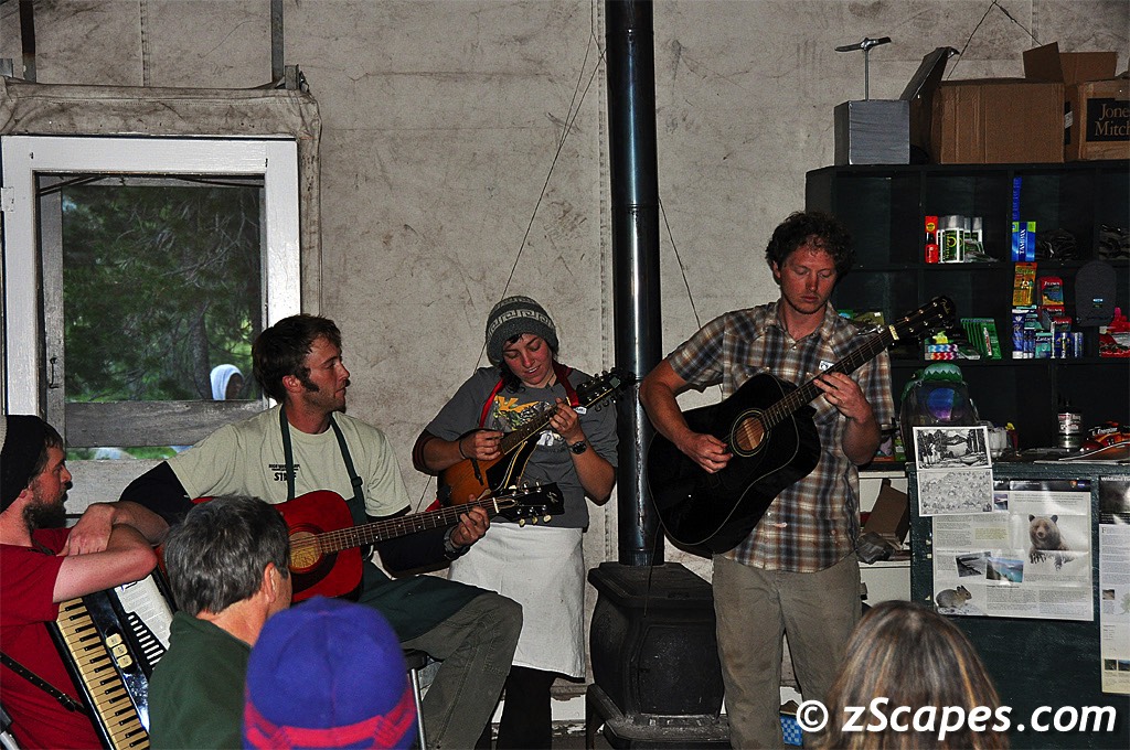 Once at the camp, George, Chris and I scrambled up Buck Dome to see the panorama of ridge lines all around. The camp is located in an interesting spot that gets you a backside perspective of well known peaks and features, with Matthes Crest taking center stage. Nestled above the meadow, it has a cozy kind of feel to it, yet the tents are not on top of each other. That night, we were treated to readings of John Muir, music by the Sunrise Quartet and another round of crystal clear starlight. Daybreak brought frost covered meadows and UFO skies.