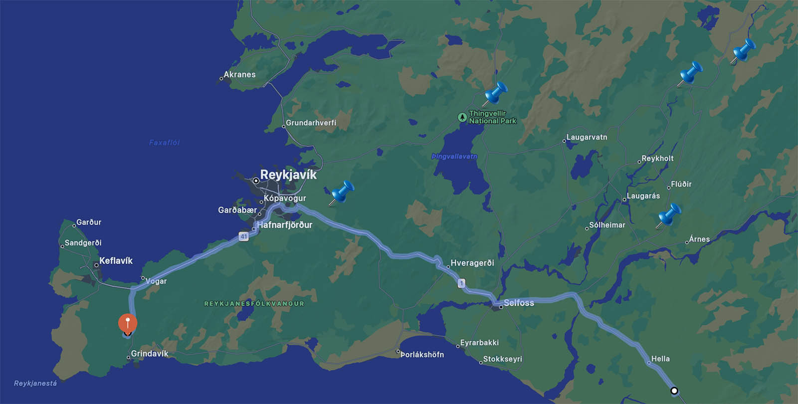 Our last day! Betsey was fending off a nasty head cold, so Kathleen and I went off to be her eyes and ears. Our first stop was Grindavík, just south of the Blue Lagoon, that had been evacuated after the Sundhnúkur volcano erupted on December 18th 2023. The town is slowly coming back as it is a major fishing harbor. A lot of the residential sections are deserted, with evidence of destruction from seismic and lava activity. What is amazing are the special engineering skills the Icelanders master to get life back to normal. From paving roads with the ground still steaming to erecting a 13 foot high wall around the town, the Blue Lagoon and the close by power plant to divert/slow any future lava flows. Amazing! Next, we were off to Volcano Valley where the last 3 eruptions (2021, 2022, 2023) and lava flow emanated from. The park has plenty of trails to go off and hike the lava fields and viewpoints. Strandarkirkja, a historic seaside church was followed by a dive into the underworld at Raufarhólshellir descending into a lava tunnel. Highlight of the trip was being immersed in pitch back darkness. Something to be felt not seen. We ended the day at the Krýsuvík thermal pools and a bit of shopping in Reykjavik.